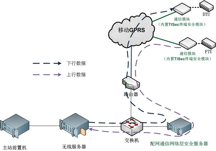 采用TISec系统对通信模块从网络层进行必要的加固,不但能够全面提升其应对网络攻击的能力,使其安全强度与DTU/FTU等业务设备具备相同的安全强度,而且不会对原系统包括应用层安全加固造成任何的影响,达到了增加防御纵深的目的,从而达到全面提升整体系统的安全健壮性的目标,满足配网系统网络层安全传输的应用需求。附图为TISec系统在配网通信网络层的部署拓扑。