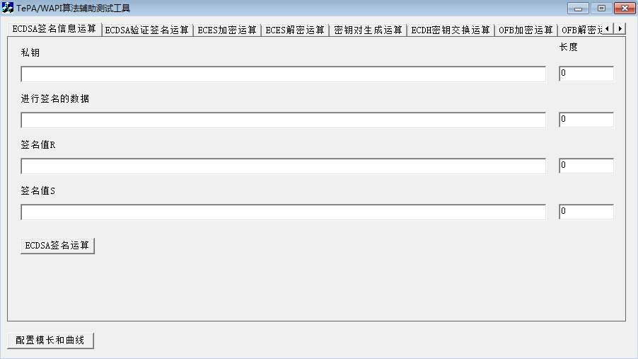 WAPI算法测试工具运行于Windows操作系统环境下,提供了GUI用户操作界面,方便用户操作。工具支持Fp有限域下192bits、224bits、256bits三种曲线长度的椭圆曲线参数配置,支持WAPI协议相关的所有算法运算,包括ECDSA、ECDH、SMS4和SHA256等算法,并支持OFB、CBC应用模式。