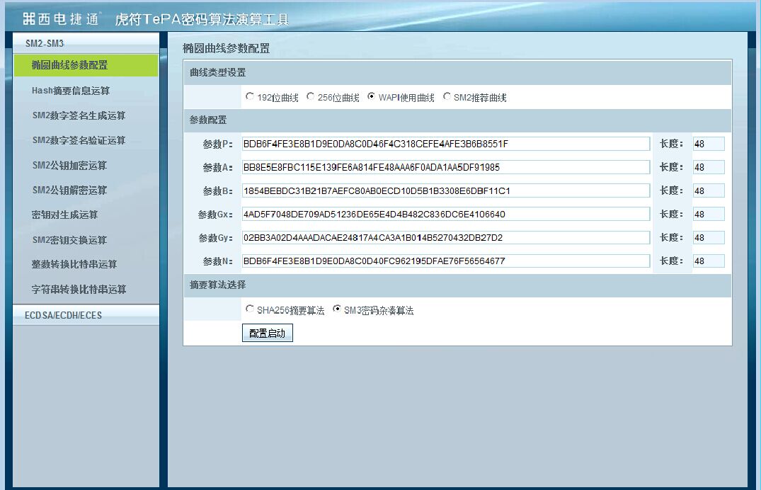 虎符TePA密码算法演算工具运行于Windows操作系统环境下,提供了友好的GUI用户操作界面,方便用户操作。基于ECC算法的椭圆曲线参数配置支持四种模式,192bits和256bits曲线配置模式可填入Fp素数域的任意曲线值,为用户提供极高的灵活性,WAPI曲线和SM2曲线配置模式为固定参数,用户无需输入复杂的曲线参数,一键获得参数,为用户提供高效的易用性。执行基于ECC算法运算前,首先需要完成椭圆曲线参数配置,此类算法包括SM2签名、SM2验证、SM2加密、SM2解密、SM2密钥交换、ECDSA签名、ECDSA验证、ECES加密、ECES解密、ECDH密钥交换、密钥对生成、摘要运算、整数转换比特串和字符串转换比特串等。