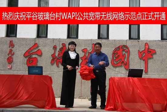 北京平谷区玻璃台村的WAPI公共宽带无线网络应用试点正式开通。在其区域范围内的手机、电脑、笔记本等终端设备,可通过该网络实现安全的宽带无线上网。西电捷通是主要供应商。