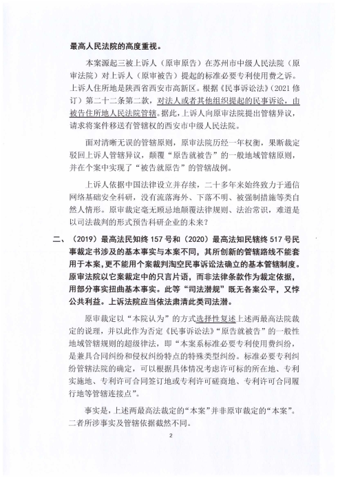 点击阅读 三星诉西电捷通标准必要专利使用费案司法文书(2022)苏05民初272号、(2024)最高法知民辖终229号